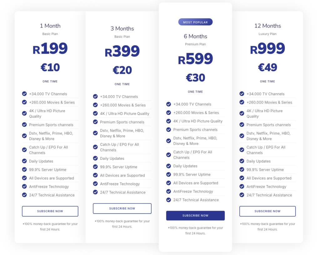 • 1 Month Basic Plan – R199 (€10): Great for first-time users who want to validate quality, stability, and channel coverage before committing longer.
